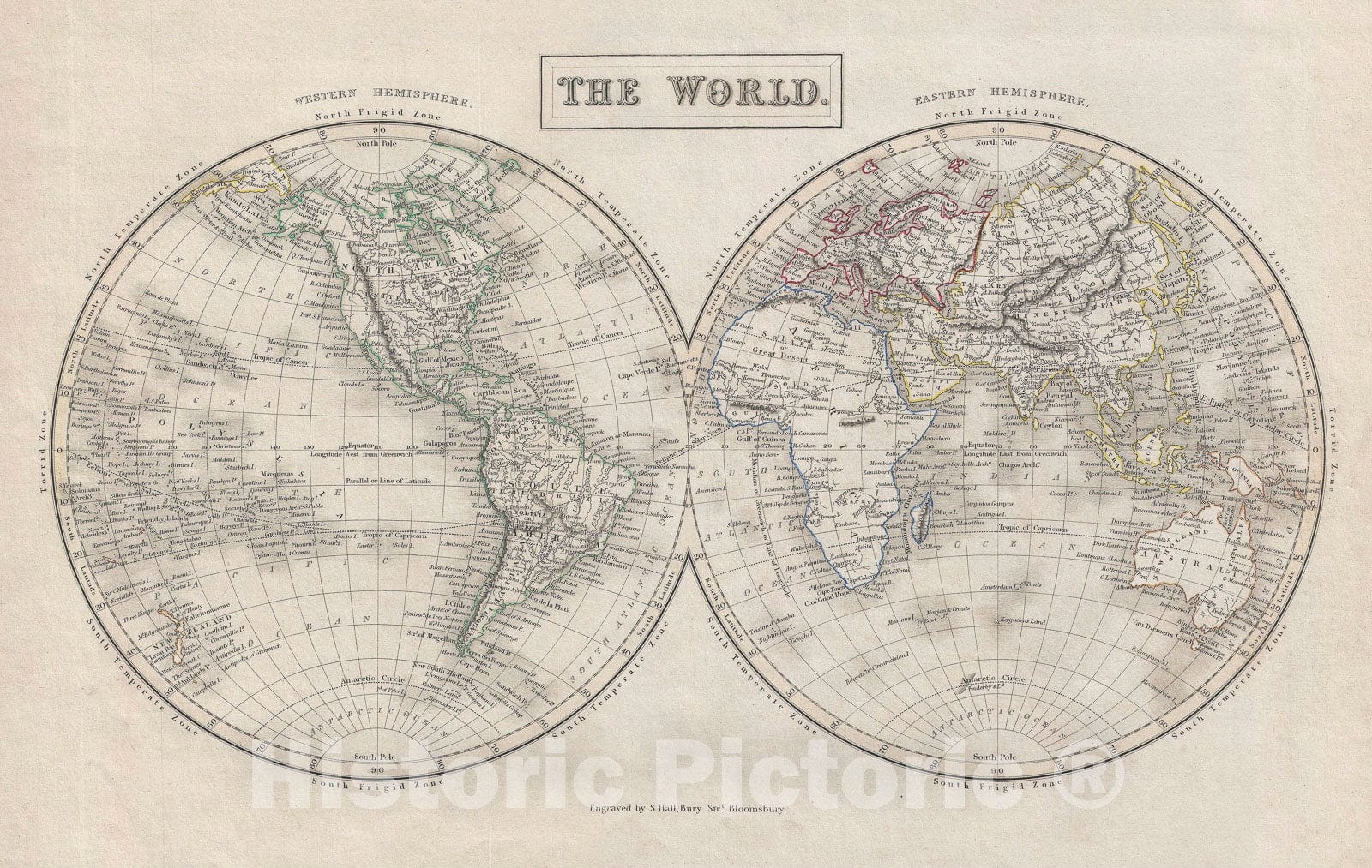 Historic Map : The World in Two Hemispheres, Black, 1840, Vintage